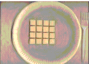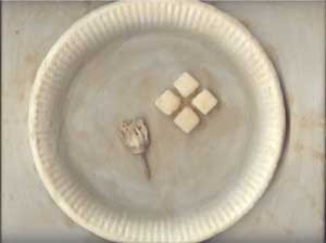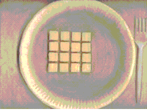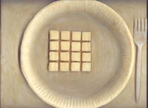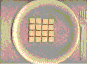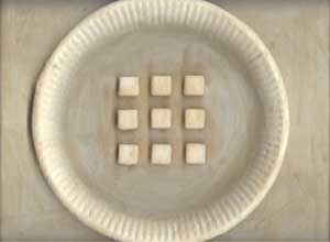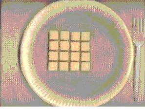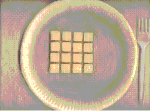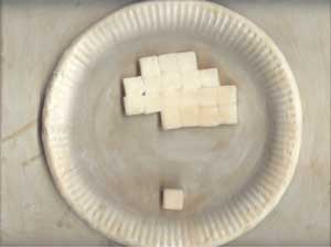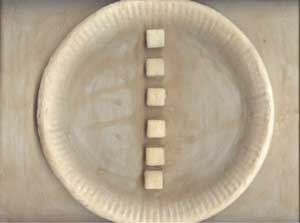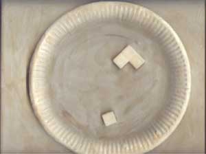 "Happchengesellschaft" - Baukasten für Multimedialeprojektionen Was aus einiger Entfernung wie eine Reihe von Alabaster-Tafeln aussieht, stellt sich bei näherer Betrachtung als Ansammlung , wachsüberzogener Pappteller-Stilleben heraus, bei der lediglich die Anordnung der viereckigen Würfel auf den Tellern variiert. zitiert aus Stadtanzeiger Plochingen Oktober 2000 |